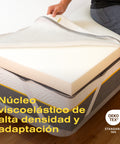 - Este topper está elaborado con espuma viscoelástica de alta densidad que se adapta a la forma de tu cuerpo, ofreciendo un alivio de presión en los puntos clave de tu anatomía. Además, su funda es desenfundable y lavable, lo que te permite mantenerlo limpio y fresco por más tiempo. La funda está fabricada con materiales transpirables que favorecen la ventilación del topper y, por ende, la regulación de la temperatura.