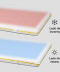 • El topper viscoelástico de Ferlex también se distingue por su diseño de doble cara, pensado para adaptarse a las distintas estaciones del año. Por un lado, presenta una cara de invierno, que proporciona un mayor aislamiento térmico y retiene el calor corporal, manteniendo al usuario abrigado en las noches frías. Por otro lado, la cara de verano está diseñada para ofrecer mayor frescura y ventilación, ayudando a disipar el calor y proporcionando una sensación más ligera y fresca durante los meses cálidos.